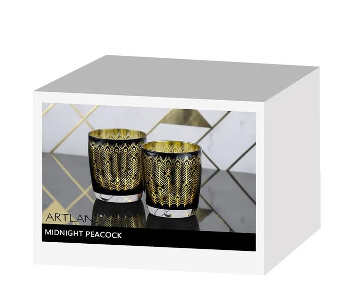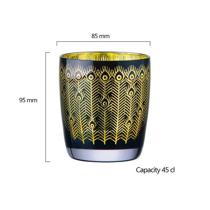 This set of two beautifully crafted tumblers features a stunning design, with a sleek black exterior and a luxurious gold interior, electroplated to perfection. Adorned with intricate peacock feather detailing around the bowl, these tumblers bring a sense of exotic elegance to any setting. Perfect as stemless glasses, water glasses, or even wine glasses, the Midnight Peacock tumblers are a versatile and sophisticated addition to your tableware and glassware collection.