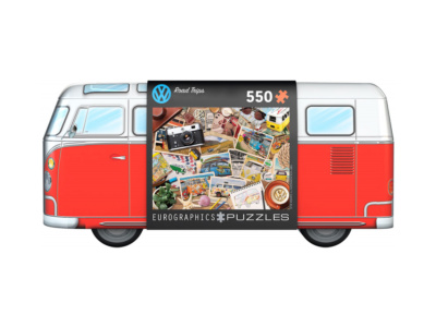 Retro paint splashed style puzzle celebrating the history of Volkswagen bus. Puzzle stored inside VW bus shaped tin packaging.