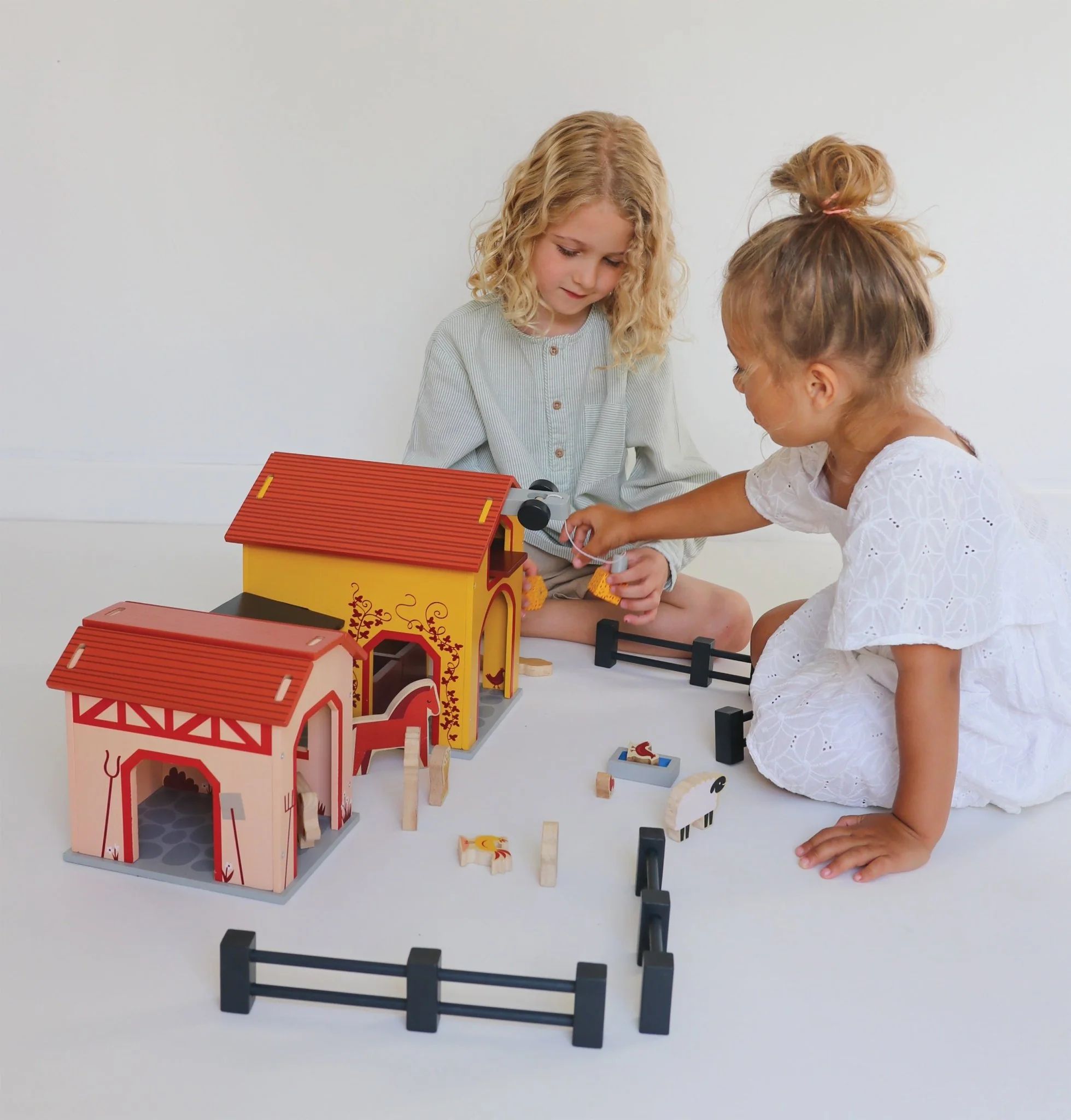 This farm ranch toy comes with a barn and stable, and a working pulley, a milking shed, a grain store, 4 fence pieces, a horse, a sheep, 2 pigs with a trough, a rooster, 2 hens, 2 hay bails, some wheat, the farmer and his wife.