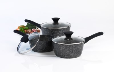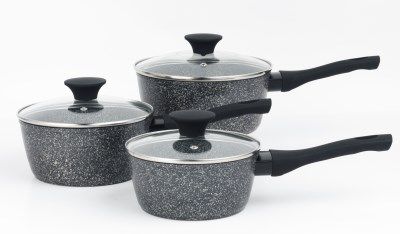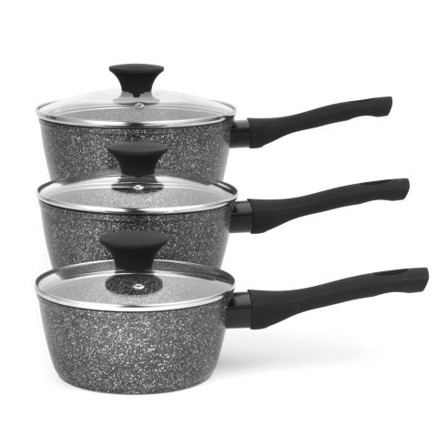 Enhance your kitchen collection with the 3 Piece Pan Set from the Salter Megastone Collection. The set includes 16, 18 and 20 cm saucepans with corrosion resistant forged aluminium bodies so that the coatings protect from scratches and long lasting damage. Make mealtime healthy by using little to no oil thanks to the Megastone non-stick interior coating. Boasting Bakelite soft touch handles, the pans can be easily manoeuvred and come with tempered glass lids ideal for boiling vegetables.
