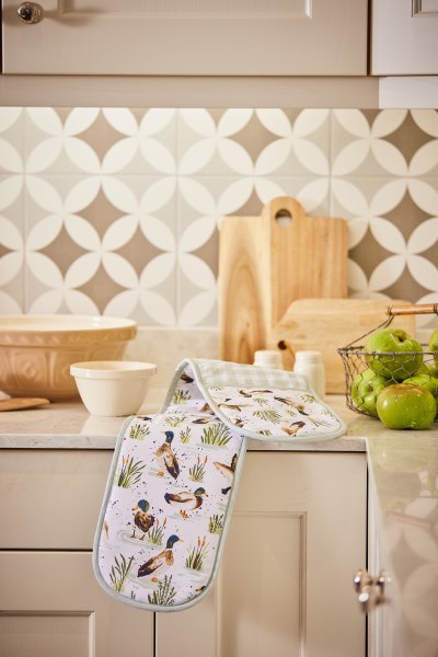 Adorn your kitchen with rustic farmhouse charm with our Farmhouse Ducks collection. Hand-painted mallard ducks waddle, swim and shake their feathers across this homely range of kitchen accessories. The soothing sage green tones are enhanced with pops of orange bulrushes and the paint spattered water brings movement and life to the scene. An endearing illustration that’s set to be this season’s bestseller.