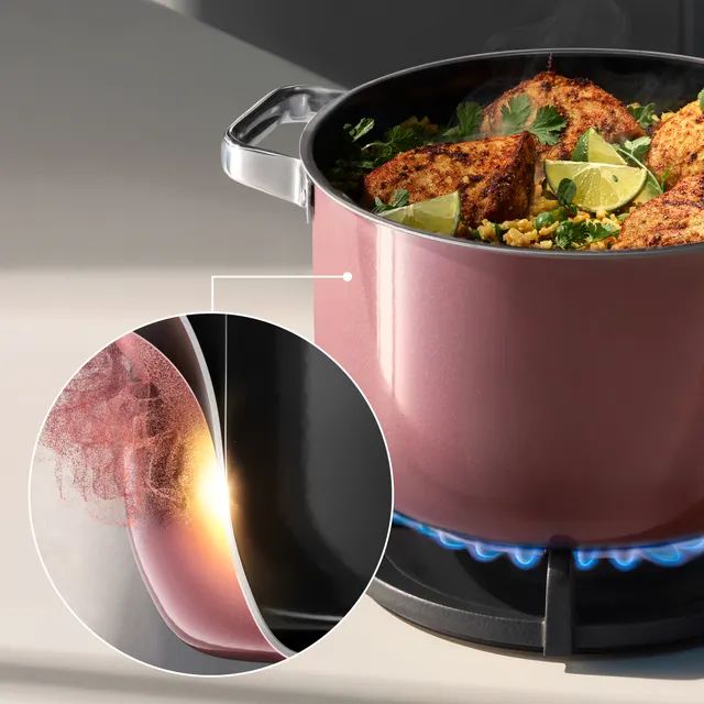 This unique material consists of a special alloy that combines the best properties of existing cookware materials – the thermal conductivity of copper, the heat storage capacity of cast iron, the scratch resistance of glass, corrosion resistance of stainless steel and the uniformity of cooking/frying results of aluminium.